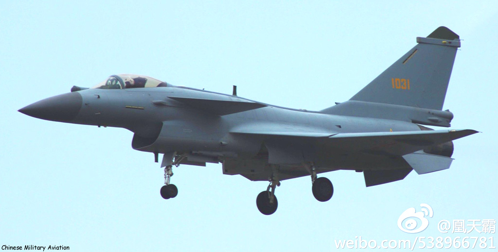 A PLAAF J-10B (K/JJ10B?) multirole fighter was on static display carrying two YJ-91 ARMs. This much improved variant made its maiden flight on December 23, 2008, powered by a Russian AL-31FN engine (1031 prototype). The improvements include a DSI/"Bump" inlet which not only cuts weight but also reduces RCS, after a similar design was first tested onboard FC-1/JF-17. The aircraft also features a new indigenous IRST/LR in front of the canopy, a white IFR probe light on the starboard side of the nose, a JF-17 style glass cockpit with a wide-angle holographic HUD, three large color MFDs. The new IRST allows passive detection of enemy aircraft, making J-10B more stealthy in combat. Its nose appears flatter too, similar to that of American F-16, housing a new fire-control radar which is thought to be an X-band PESA developed by the 607 Institute (track 10, engage 4 simultaneously), the first of such type ever being developed for a Chinese fighter aircraft, giving J-10B a stronger multi-target engagement and ECCM capability. It was rumored that initially the aircraft was planned to be fitted with an AESA developed by the 14th Institute but the radar was not ready by the time the aircraft was in production. An ECM antenna can also be seen right in front of the canard foreplane on the 1035 prototype. The tip of vertical fin was redesigned as well, featuring a long compartment housing communication and ECM antennas, which resembles that of French Mirage 2000. A rear facing MAWS sensor can be seen underneath the parachute boom. A similar system was tested onboard FC-1/JF-17. All these improvements suggest that J-10B is equipped with a new generation of integrated electronic system connected via an optic HSDB, ranging from radar to EW system. Its mission may be changed from air-superiority to multi-role, such as CAS or EW. For air-superiority mission, normally 6 AAMs (PL-12x4 + PL-8x2 or PL-10x2, PL-12s are carried underneath the dual missile launch rails) are carried. However it appears that the aircraft is unable to carry the latest PL-15 AAM. For CAS missions, it is expected to carry 2 KD-88/88A AGMs, or 2 JG-500 LGBs, or 2 new JG-500B 500kg LGBs. 2 YJ-91s can be carried for SEAD missions. The laser designator pod is thought to be K/JDC01A. A K/RKL700A ECM pod can also be carried underneath the engine air intake for enhanced EW capability. Overall J-10B is thought to be comparable to American F-16E/Block 60. The 03 prototype (1033) first flew in August 2009, with the pitot tube removed from the nose tip. Both 1031 & 1034 prototypes were tested at CFTE. An indigenous WS-10B turbofan engine was tested for some time on 1035 in 2011 but did not proceed forward. Due to the PESA radar installed, J-10B may not enter the service in large quantity with PLAAF. In March 2013 the 1031 prototype was seen with ECM antennas installed ahead of the canard foreplanes similar to those onboard 1035, which represents the