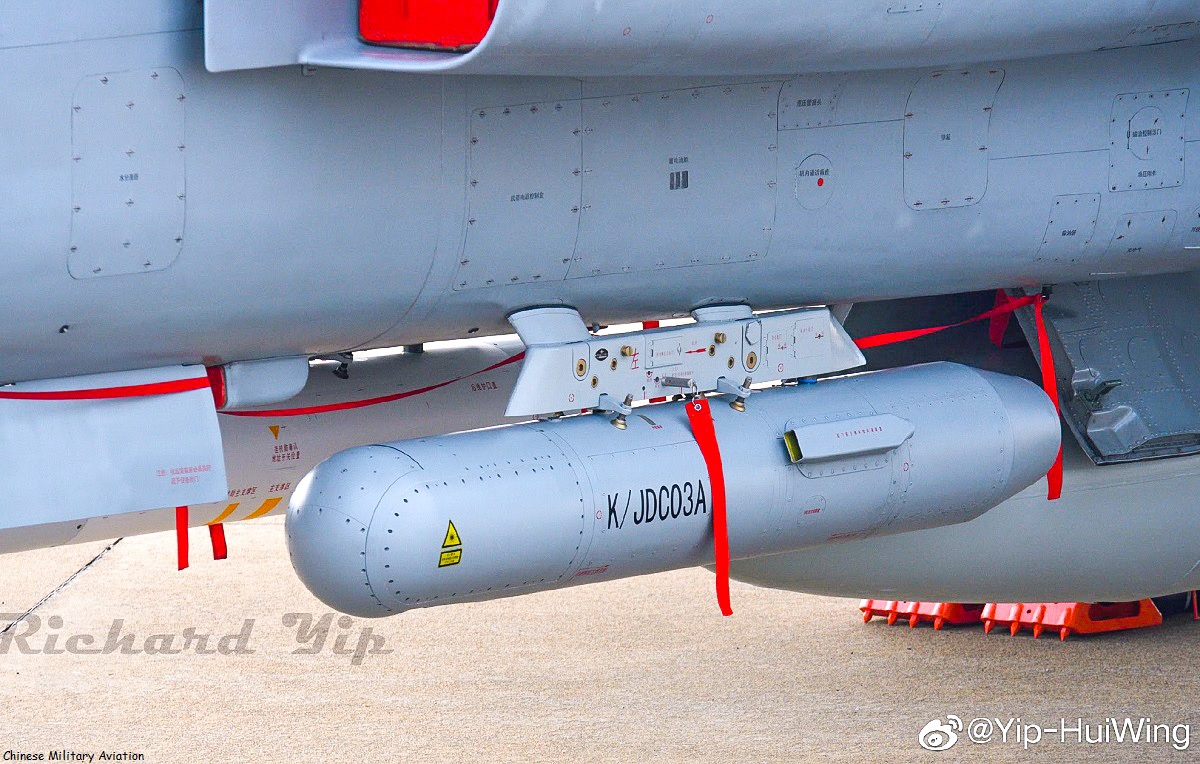 A PLAN JH-7A was patrolling while carrying a YJ-83KB AShM. The first batch of JH-7A entered the service with PLAAF (S/N 64x2x, 69x4x, 72x1x, 78x6x, 73x7x) in late 2004. Unlike the naval JH-7A (S/N 83x9x, 82x5x, 82x7x) which first entered the service earlier in 2004, it wears a medium-blue color scheme and has the serial number painted under the side of cockpit. First revealed as a full-scale mockup, this improved variant of JH-7 was seen carrying a full range of air-to-air and air-to-surface weapon load, reflecting its enhanced capability of launching precision strikes using anti-radiation missiles and LGBs. The precision strike capability is believed to be a major requirement JH-7A has to meet in order to attract orders from PLAAF. This capability is thought to be achieved by the JL-10A/AG (K/LKK10?) multi-mode PD radar integrated into a new fire-control system, plus an improved "stabilizing" system (analog FBW) giving the aircraft a true terrain-following capability. The aircraft also features a one-piece windshield and a tandem glass cockpit (front/rear) and HOTAS. It also has new wings and horizontal stabilizers made of composite materials and have the 1950 style wing fences removed. As the result, a few hundred kilograms of weight has been eliminated. The engines are the indigenous WS-9 Qinling turbofans (certified in July 2003) replacing the original R&R Spey MK202s. The aircraft has a total of 11 hardpoints, 6 underwing, 2 wingtip, 2 under the engine intakes and 1 under the fuselage. Currently JH-7As are equipped with PL-8 AAM, JG-500 & JG-500B LGB, KD-88/KD-88A TV/IIR guided ASM and YJ-91 ARM. The aircraft was also seen carrying a Russian Kh-29T TV guided ASM for testing purpose. A datalink pod can be carried underneath the engine intake for KD-88 ASM. Similarly a laser designation pod (K/JDC01 or K/JDC03A) can be carried to paint targets for LS-500J LGBs. The naval JH-7A can also carry two large ECM pods. In addition to ECM missions, the aircraft can also fly ELINT/SIGINT missions carrying two receiver pods. It can also drop 250kg aerial mines (MKC-03-500?) as well. 5 prototypes were built (#811-815), with the first JH-7A prototype taking off on July 1, 2002. Since 2009 most JH-7As have been upgraded with a new UHF/VHF antenna behind the cockpit. In 2014 PLAAF JH-7A started to carry KL700A ECM pod (KG600) for self-defence. An image released in November 2016 suggested that the PLAAF JH-7A2 started to carry the bigger and more powerful K/RKZ900-x ECM pod, which can provide the electronic protection for the entire attacking formation. Its export version was called JH-7E but failed to attract any foreign customer due to its obsolete design. JH-7A's production is believed to have ended in 2016 and is expected to be replaced by J-16 (see below). An improved version called JH-7B was developed during the 2010s in order to carry the large YJ-12 AShM. Two prototypes (821, 822) were built before the project was cancelled. A recent image (August 2020) indicated that PLAAF JH-7As started to carry the serial numbers on the vertical fins. A recent video (May 2021) indicated that few PLAN JH-7As started to carry a two-digit low visibility code number. A recent image (September 2021) suggested the PLAN JH-7A started to carry an improved YJ-83K AShM (YJ-83KB?) featuring an integrated active radar/passive IIR dual mode seeker. A recent image (November 2022) indicated that the PLAAF JH-7A2 started to carry KF-98A standoff submunition dispenser, KF-088C standoff ALCM, and YJ1000 1000kg class penetrating LGB. A recent video (December 2022) indicated that the naval JH-7A started to carry a low visibility code number and insignias as well as "China Navy" characters outside its engine intakes. Another recent image (February 2023) suggested that all naval JH-7As have been transferred to PLAAF with the "China Navy" characters removed. A recent image (August 2024) indicated that some ex-PLAN JH-7As started to wear yellow serial numbers (S/N 72x7x, 70x7x, 64x6x, 74x0x) on the vertical fins. Some also started to carry the new KZ-900 ECM pod in late 2024.
